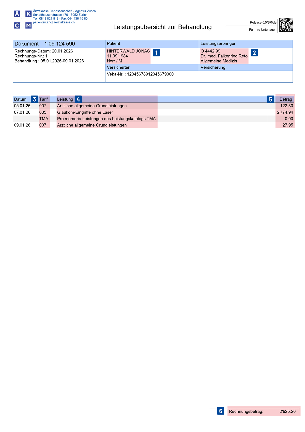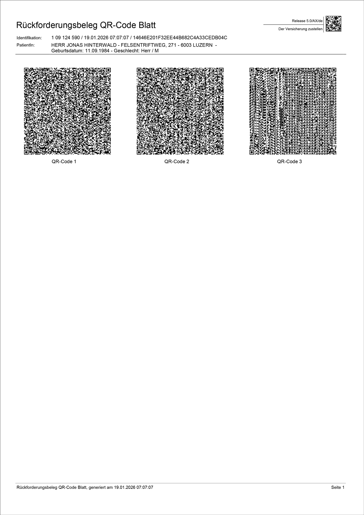Zu jeder TARDOC-Rechnung gehört ein Rückforderungsbeleg mit QR-Codes. Diese QR-Codes erhalten die Abrechnungsdaten in elektronischer Form und sind für die Krankenkasse bestimmt.