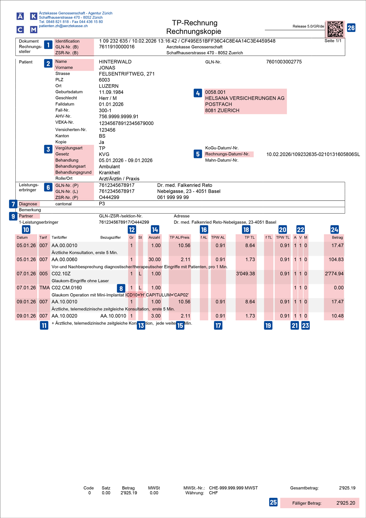 | 24. | Betrag: CHF-Betrag der Tarifposition berechnet sich aus: Anzahl x ([Taxpunkt der ärztl. Leistung x Skalierungsfaktor ärztl. Leistung x Taxpunktwert der ärztl. Leistung] + [Taxpunkt der Technischen Leistung x Skalierungsfaktor der Technischen MWSt.-Nr.: CHE-999.999.999 MWST Gesamtbetrag: 2'925.19 | |